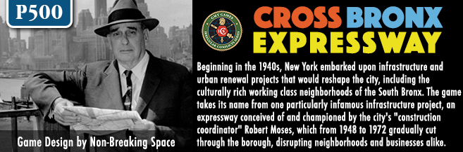 Cross Bronx Expressway is the third game in the Irregular Conflicts Series. It simulates the socio-economic processes of urban development, and the human costs that result, as a competitive city-builder with collective loss conditions. Players control one of three asymmetric factions working in the South Bronx between 1940 and 2000, pursuing their own goals while cooperating to keep the borough viable. Through a card driven sequence of play, they will work to solve the economic challenges facing the area by building infrastructure and organizations, forming coalitions, mitigating the multitude of issues facing the vulnerable population, and managing resources to stay out of debt. Cross Bronx Expressway offers an engaging way to learn about the recent history of American cities, as exemplified by Jane Jacobs' pivotal work The Death and Life of Great American Cities, simulated through the case study of the South Bronx. Players will experience the conflicting incentives and complex factors shaping urban life and together determine the fate of the Bronx.