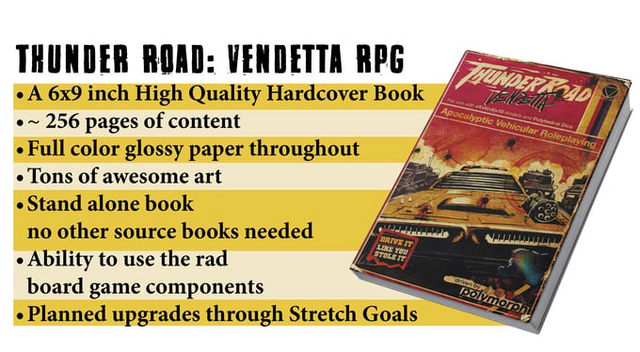 THUNDER ROAD: VENDETTA RPG brings together the over the top action of the board game with the freedom of an RPG. Explore the WASTELAND after the DISASTER. Rule the Racetrack and the RADIATION RUINS.